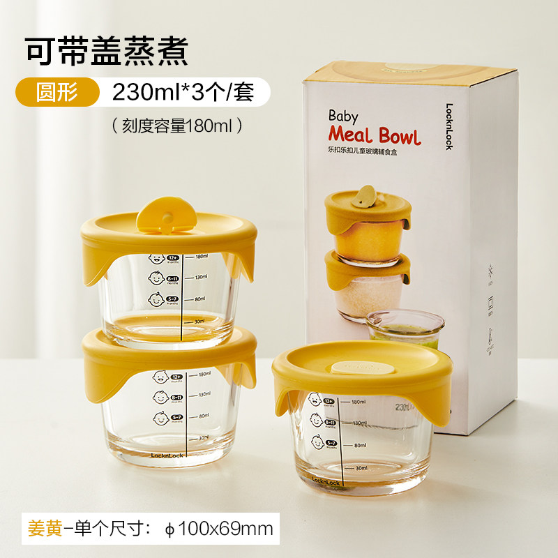乐扣乐扣辅食碗宝宝专用婴儿蒸蛋碗冷冻辅食盒水果盒玻璃保鲜盒 姜黄圆形【230ml*3】