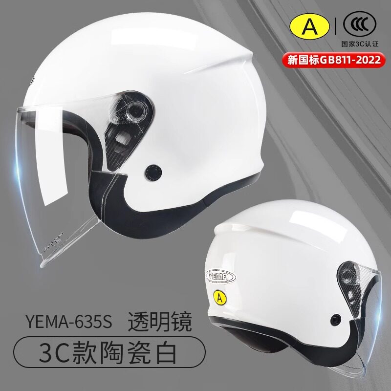 野马3c认证电动车头盔男女通用摩托车安全盔冬季保暖四季通用半盔 均码 陶瓷白+〖透明镜〗