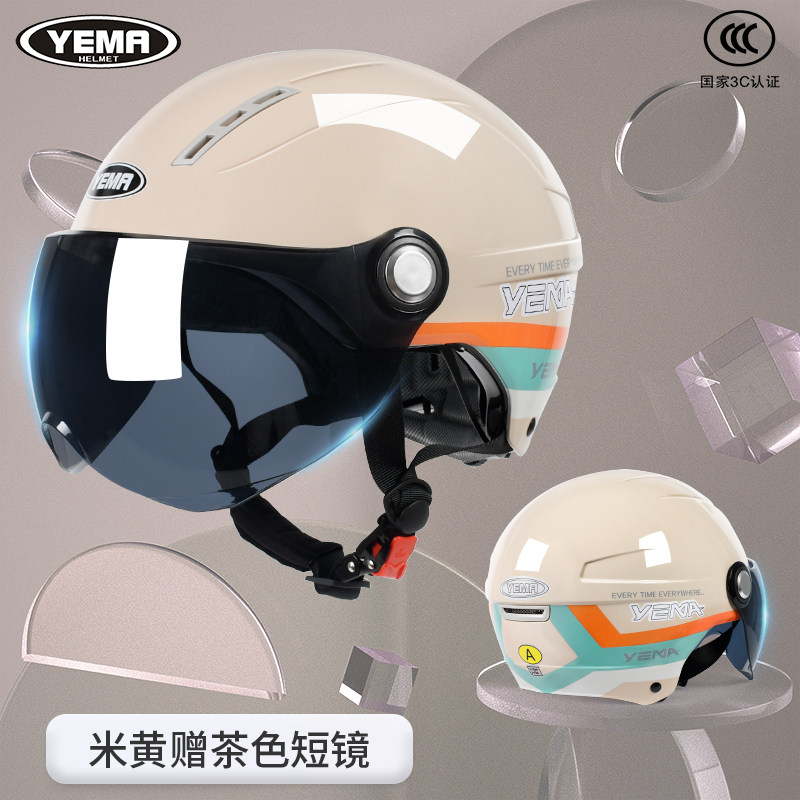 国标野马3C认证电动摩托车头盔男女夏季防晒半盔电瓶车夏天安全帽 均码 米白彩带【茶色短镜】