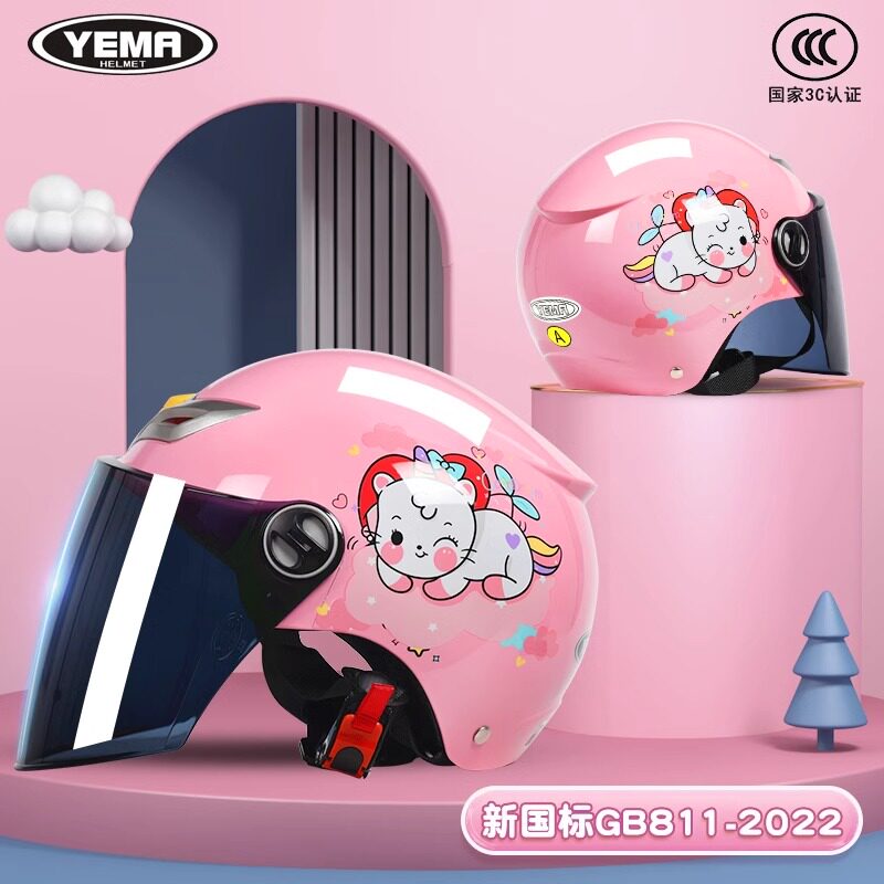 野马3C认证儿童头盔四季男女孩电动摩托车半盔夏季防晒小孩安全帽 均码 浅粉红独角小喵【茶色长镜】