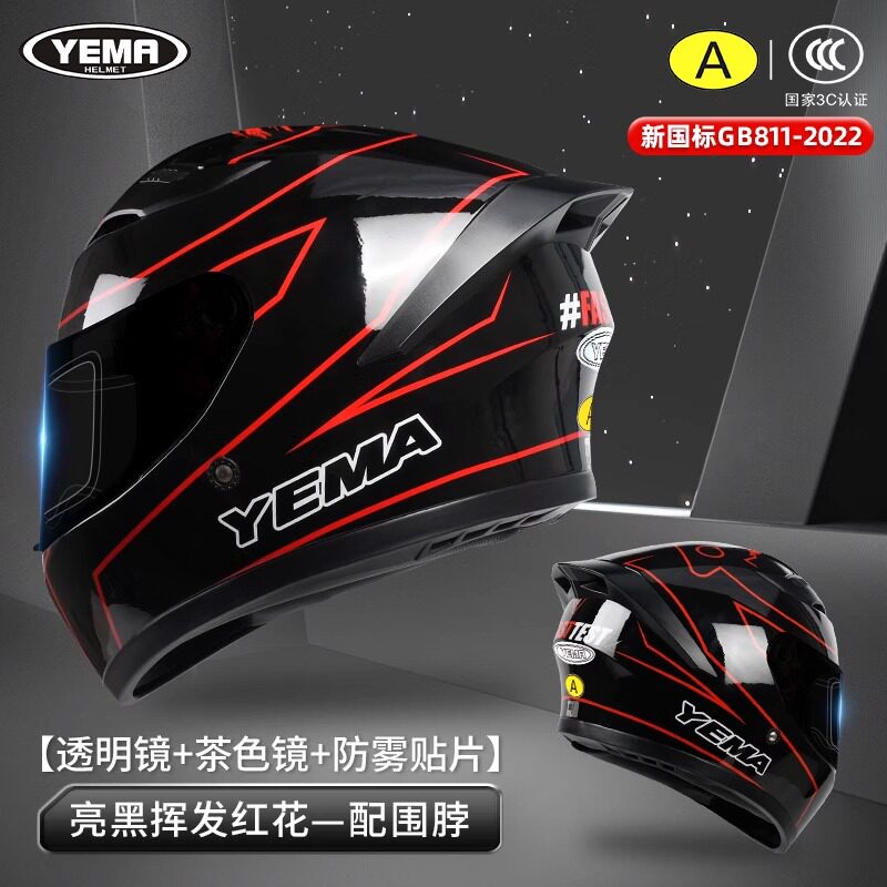3C认证野马摩托车头盔男冬季电动车安全帽女四季通用个性机车全盔 均码 亮黑红花【透明镜+茶色镜+防雾贴】