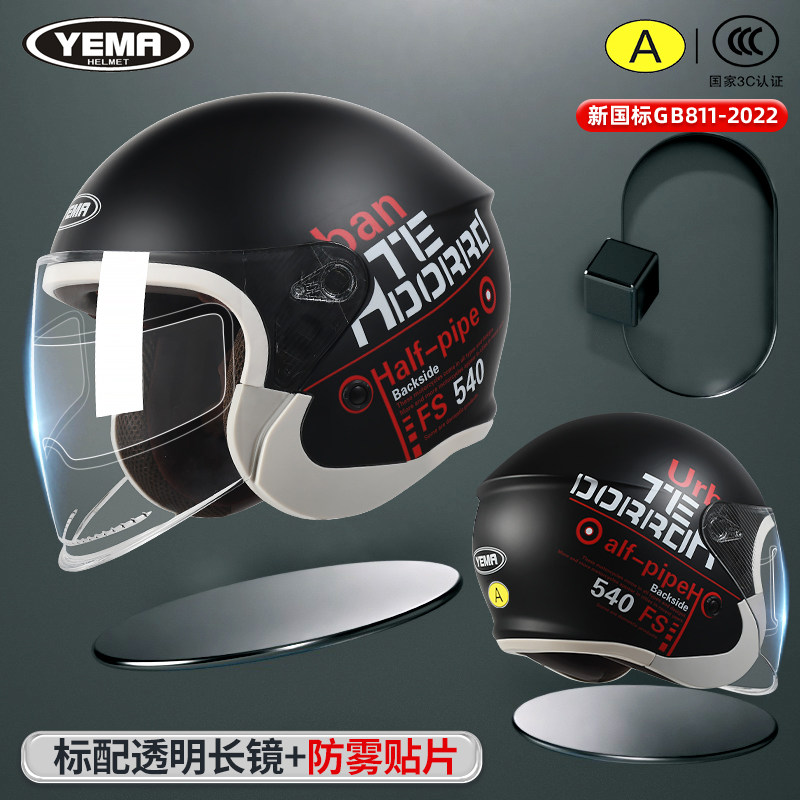 3C认证野马电动摩托车头盔女四季通用半盔灰电瓶车安全盔帽男冬季 均码 亚黑字母花-透明镜+防雾贴