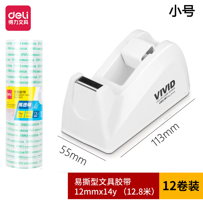 得力透明胶带小号文具胶带不留胶无痕高透明粘性强易手撕带胶带座 【宽12mm 长12.8m】12卷+小号白色胶带座 1件