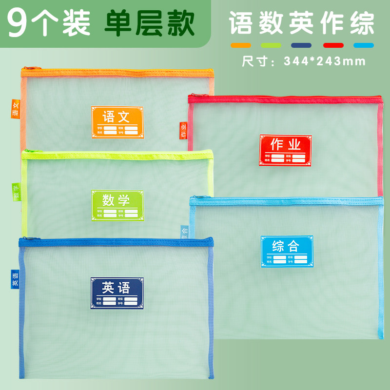 晨光科目分类文件袋透明拉链式小学生用双层网纱a4拉链袋大容量 【单层9个装】语文+数学+英语+综合3+作业3