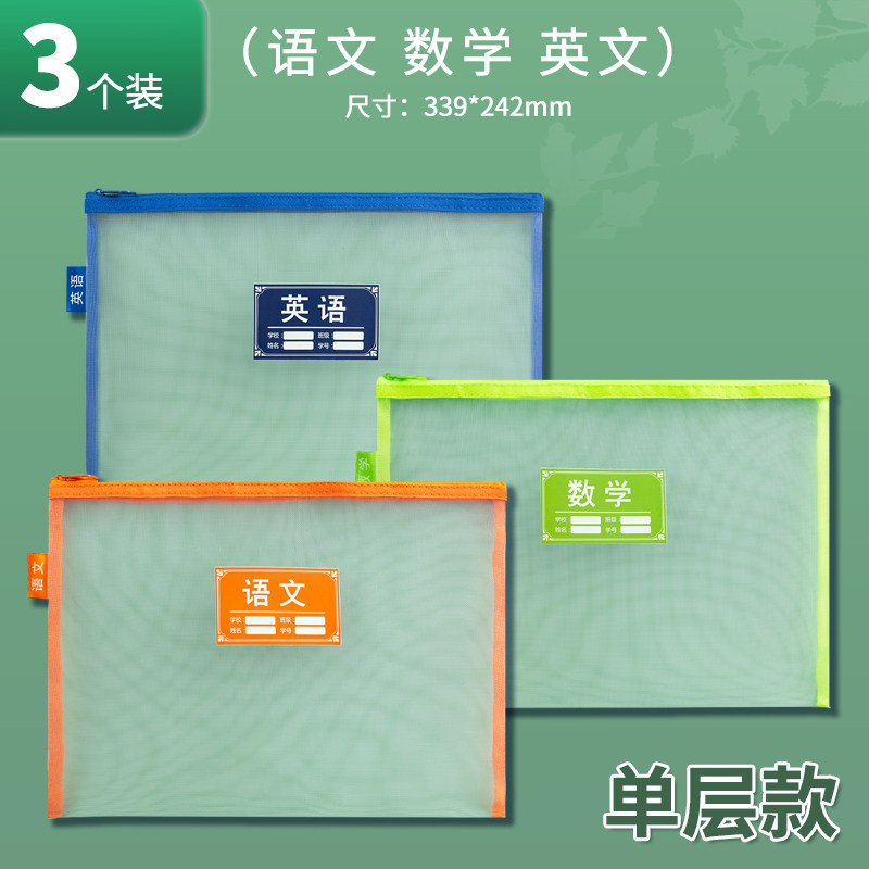 晨光科目分类文件袋透明拉链式小学生用双层网纱a4拉链袋大容量 【单层3个装】语文+数学+英语