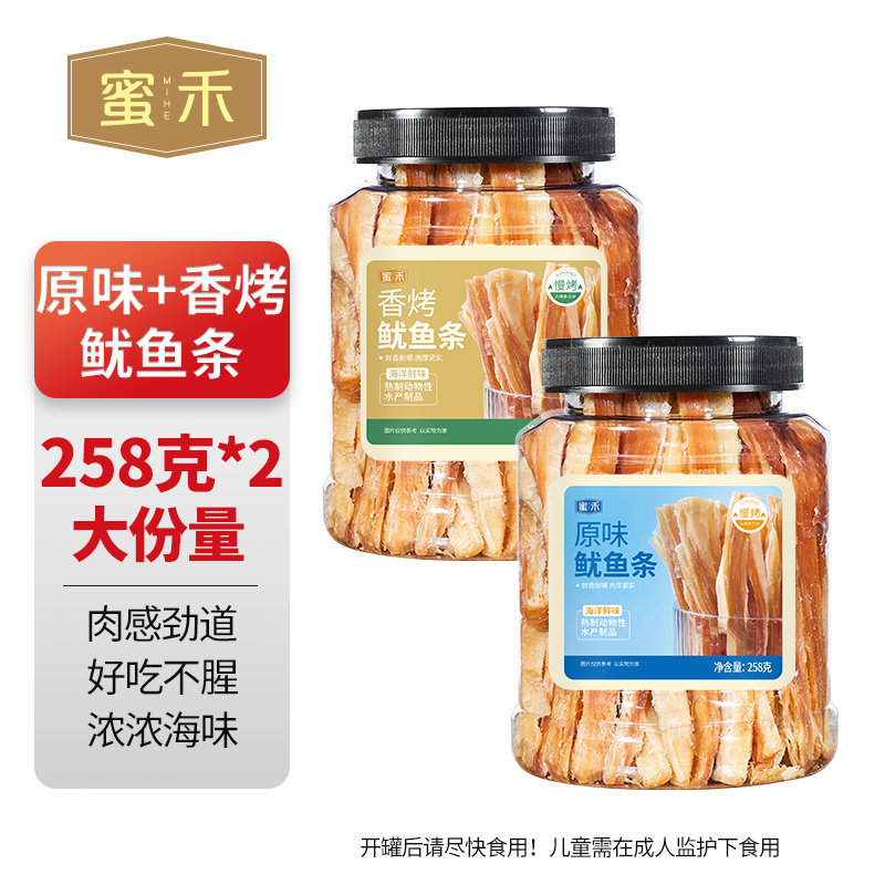 蜜禾炭烤香辣鱿鱼条手撕网红即食鱿鱼丝片海味休闲儿童孕妇小零食 原味鱿鱼条258g*1 + 香烤味鱿鱼条258g*1【共2罐】