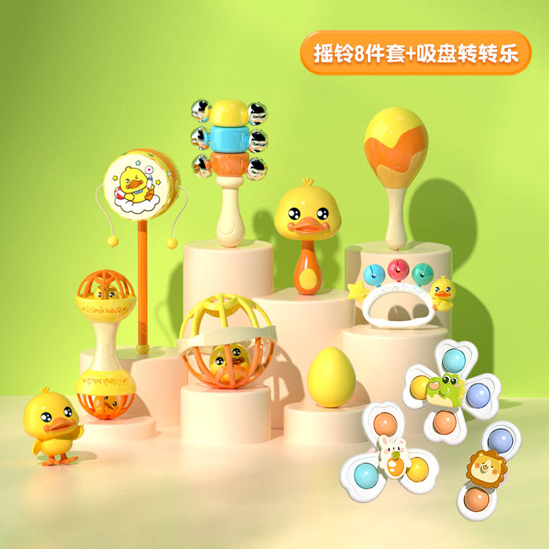 婴幼儿卡通吸盘转转乐旋转陀螺可啃咬摇铃儿童益智安抚玩具男女童 萌趣转转乐+摇铃8件套